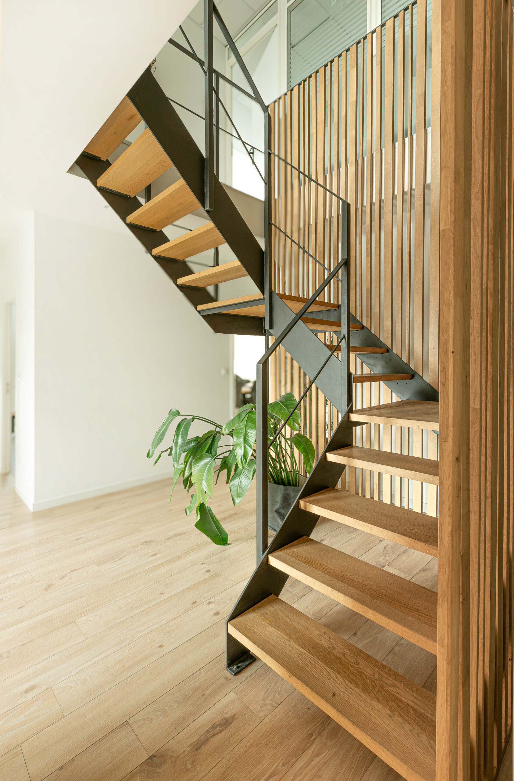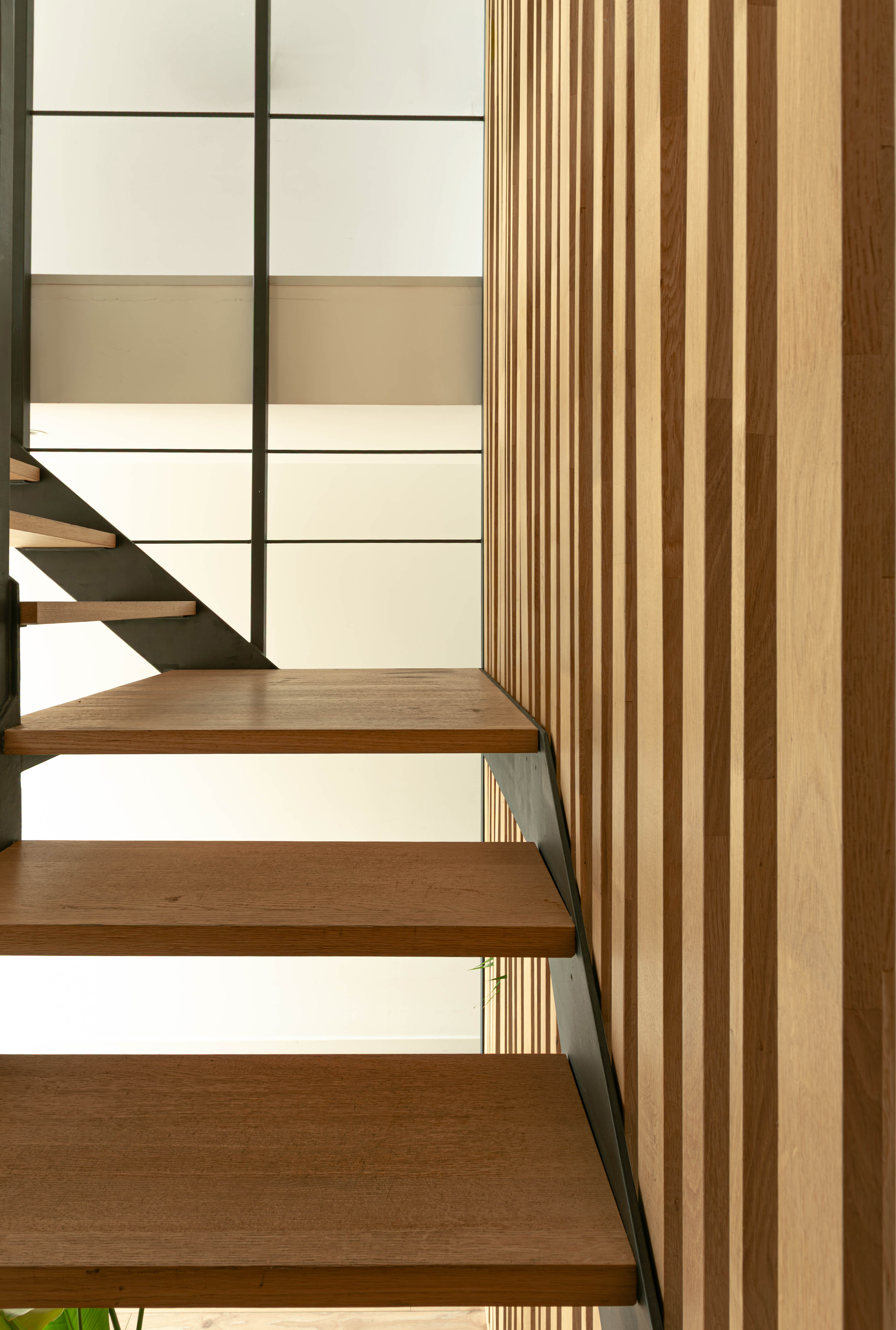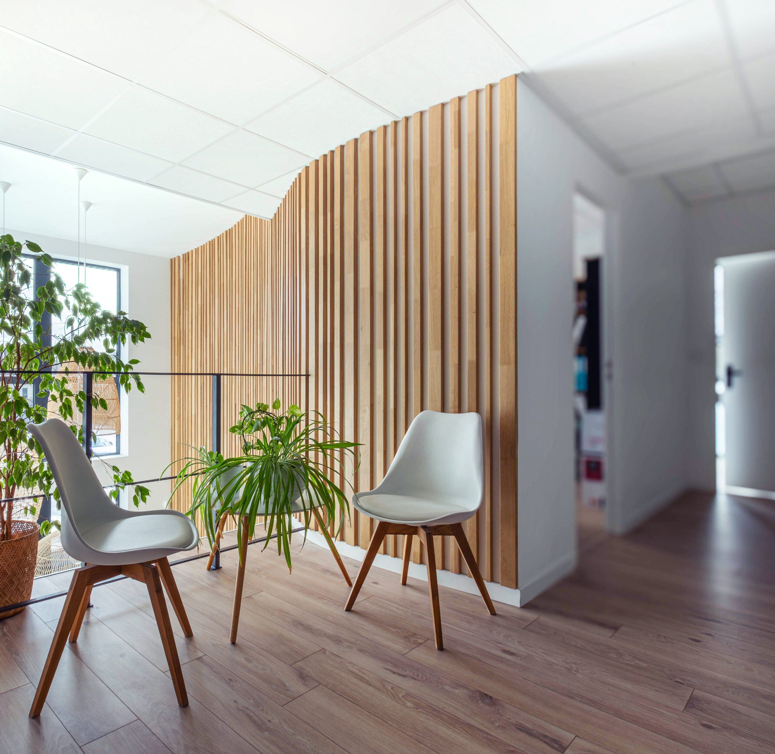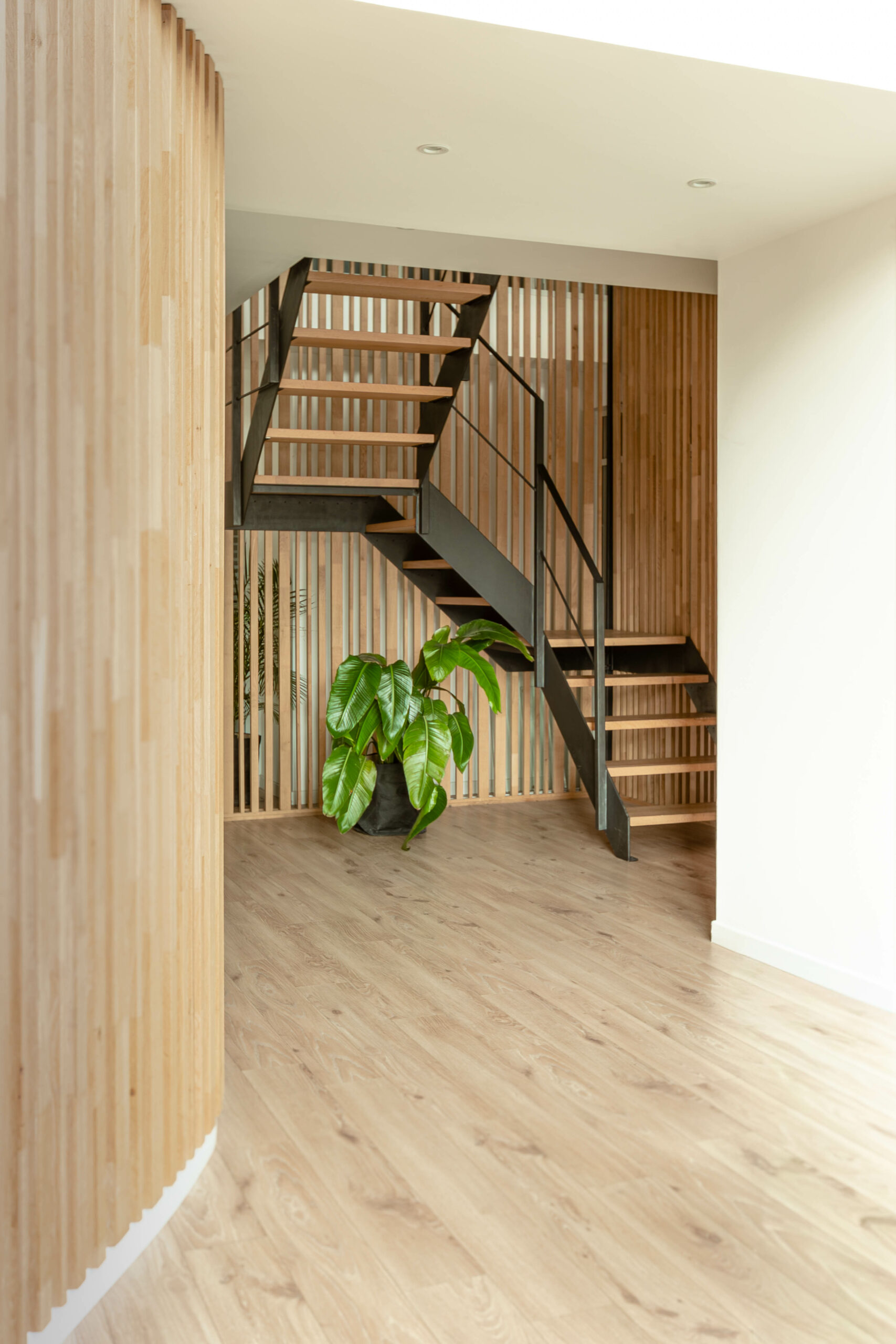 Ce projet d’aménagement d’entrée et d’escalier crée un espace d’accueil distinctif pour une entreprise, alliant design contemporain et fonctionnalité. L’escalier sur mesure en acier et bois devient un élément signature qui valorise l’image de marque. Le claustra structure les volumes et favorise la luminosité. L’ensemble propose un cadre professionnel attractif, moderne et durable, pensé pour offrir une première impression forte et accueillante.