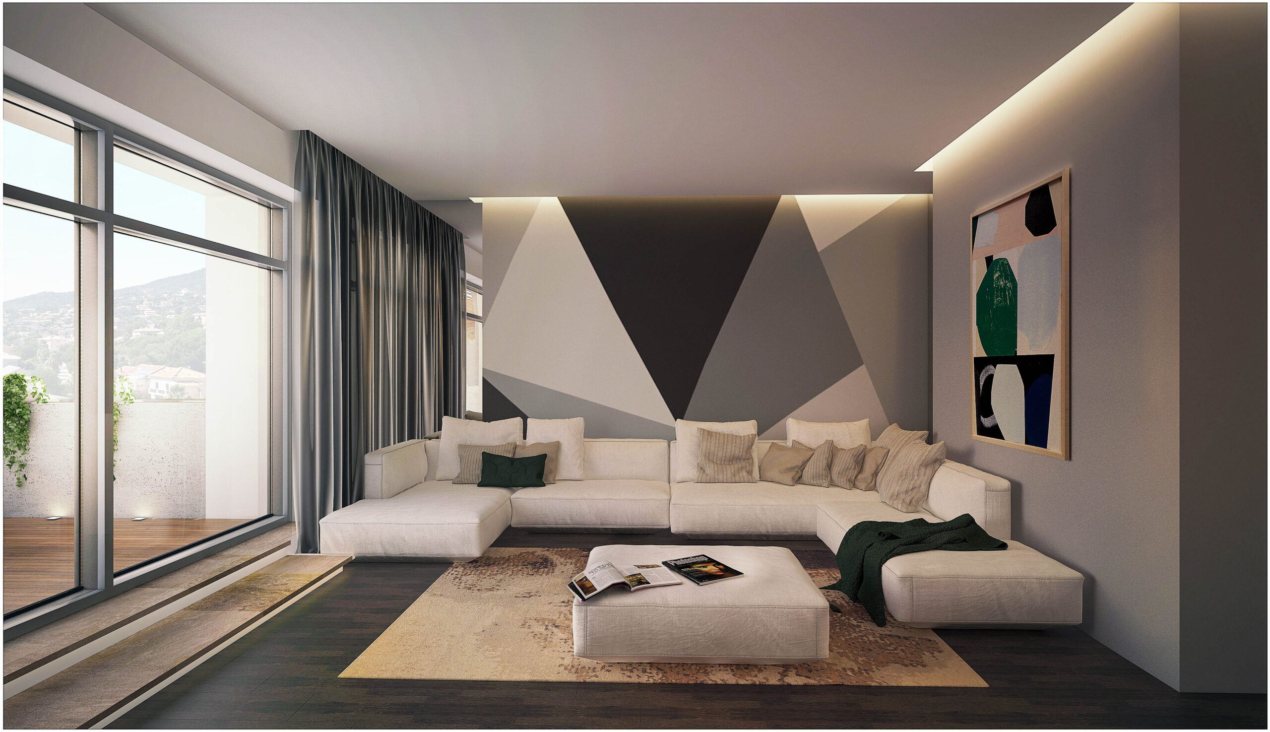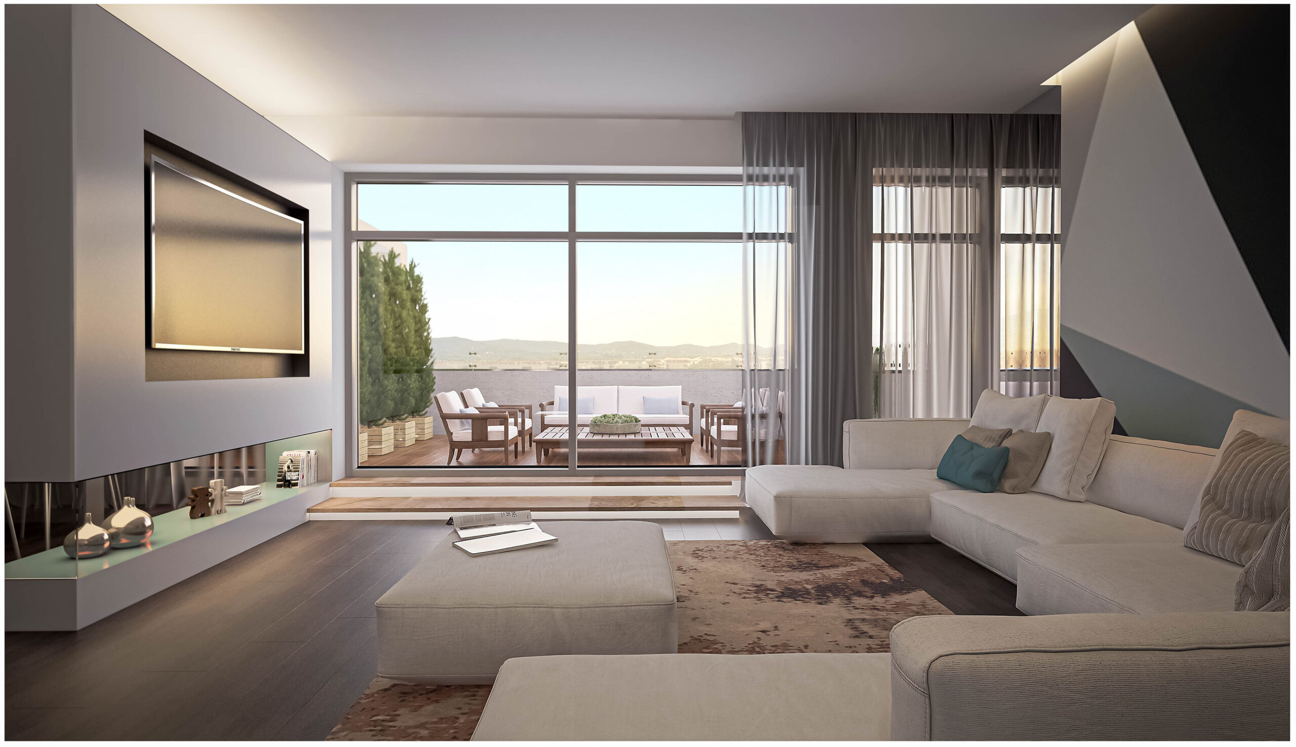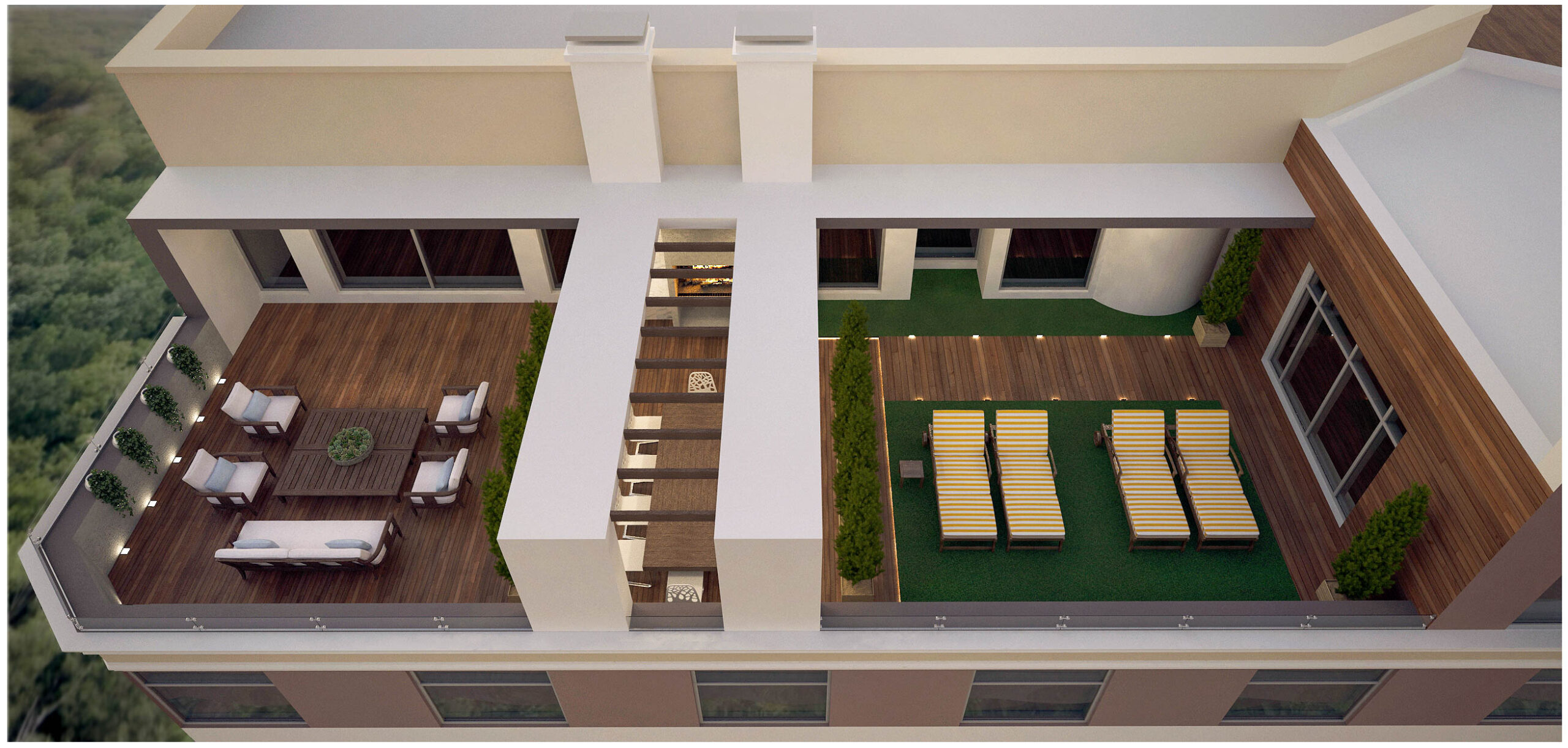La star de cet appartement : une terrasse de 100 m² pensée comme un véritable espace de vie ! Elle accueille une grande table pour des repas conviviaux, un barbecue pour les soirées d’été, un coin bronzage et un espace détente avec une table basse, parfaite pour se relaxer au soleil.